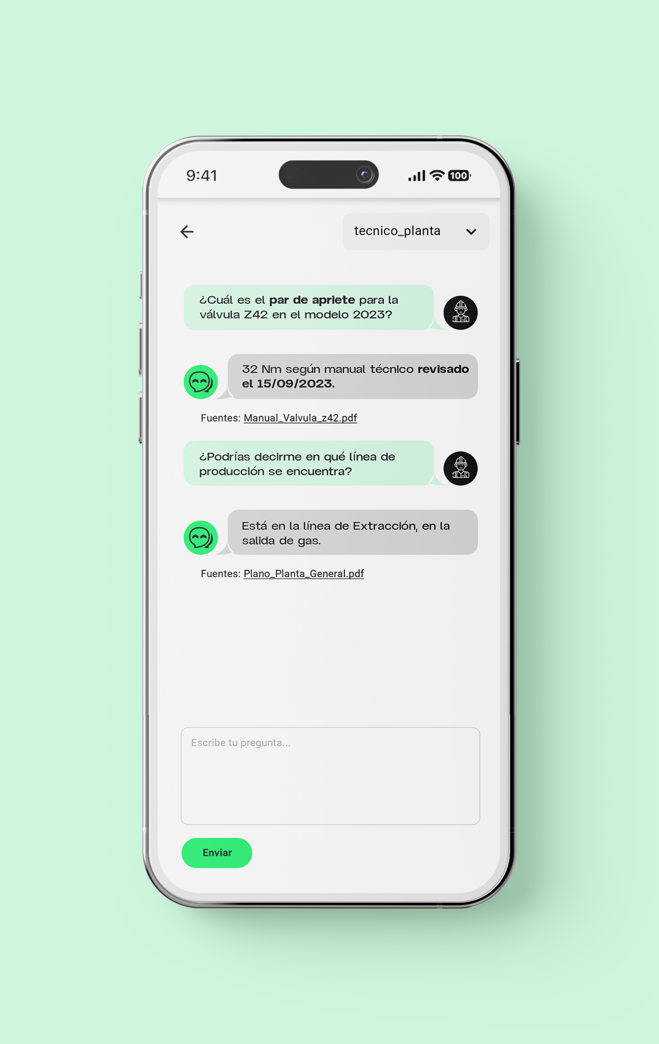 - 02. Trazabilidad total Cada respuesta cita la fuente y la versión del documento, garantizando cumplimiento industrial.